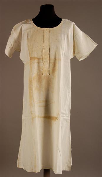 - BeschrijvingWit katoenen hemd. Ronde hals met split middenvoor. Split afgewerkt met beleg. Beleg, halsrand en mouwtjes versierd met geschulpt band. Split sluit met 2 glazen knopen en knoopsgaten. Gerende zijnaden, doorlopend tot op de schouders. Rechte mouwtjes met ingezette stukjes onder de oksels. Onder langs de zijnaden ingezette spietjes. Werd onder het korset gedragen.