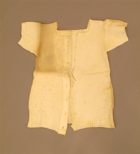 Damesborstrok van witte katoenen tricot met korte mouwtjes. Het lijfje bestaat uit een gedeelte in 2 rechts 2 averechts ribtricot (bovenste deel en het brede boord langs de onderkant en een gedeelte in 1 rechts 1 averechts (borstinzetje en een randje in de taille). Mouwtjes van 1r1av ribtricot met boordjes van 2r2av ribtricot. Voor het 1r1av tricot wordt het aantal steken van het 2r2av ribtricot gemeerderd met 1 steek per 2 steken uit het voorgaande breisel. Het voorpand bestaat uit 2 delen en wordt gesloten met 8 witte glazen knoopjes en 8 knoopsgaten. De knoopsgaten zijn gemaakt in een aangezet beleg van fijnere gebreide katoen. Het beleg is versierd met een in de lengterichting opgestikte, zigzag gelegde, dikke katoenen draad. Langs de vierkante hals met afgeronde hoeken een open randje. Mogelijk bedoeld als positiekleding
