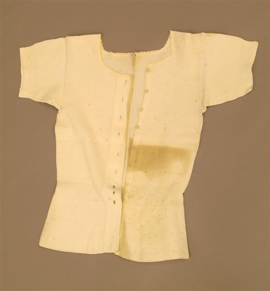 Borstrok van witte katoenen tricot met korte mouwen. Het is geheel gebreid in 1r1av ribtricot. Op taillehoogte en langs de onderkant van de mouwtjes zijn randen gebreid met fijner garen. Het voorpand bestaat uit 2 delen die gesloten worden met 9 creme glazen knoopjes en 9 knoopsgaten. De knoopsgaten bevinden zich in een aangezet beleg van fijner gebreide katoen. De onderste 3 knoopsgaten zijn ter hoogte van de taille geplaatst. Het beleg is versierd met een in de lengterichting opgestikte, zigzag gelegde dikke katoenen draad. Langs de rand met knoopjes van het linkervoorpand is op de binnenzijde een keperbandje aangebracht ter versteviging.
