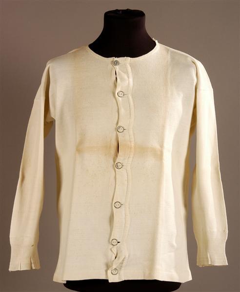 Wit katoenen borstrok in plattricot met lange mouwen. Ronde hals. Voorpand in 2 delen die gesloten worden met 7 katoenen knopen en 7 knoopsgaten. Rand onder de knopen versterkt met een reepje keperkatoen. Knoopsgaten gemaakt in een aangezet beleg van keperkatoen. Lange mouwen met boorden versierd met enkele ingebreide witte randjes. Onder de oksels vierkante ingezette stukjes. De hals is aan de rugzijde verstevigd met een ingenaaid stukje tricot. De patroondelen zijn uit de stof geknipt en met overlocksteken aan elkaar genaaid. Zware kwaliteit, materiaal gelijk aan dat van onderbroek inv.nr. 12486.