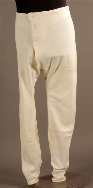 Witte interlock herenonderbroek met lange pijpen. Split middenvoor verstevigd met een beleg van witte keperkatoen. Langs de bovenrand van de broek een beleg dat doorloopt tot onder de sluiting. Sluiting met 4 knopen, 3 van kunststof en 1 van glas (waarvan 3 boven en 2 naast elkaar) en 4 knoopsgaten. Ingezet kruis. Langs de bovenrand, aan beide zijden 2 lussen van witte keperkatoen, 2 plooien in het achterpand. Splitje sluit middenachter met wit katoenen veterbandje door 2 knoopsgaten. Aangezette boorden in 1r1av ribtricot. Panden en boorden aan elkaar gezet met overlocksteken. Mogelijk behorend bij inv.nr. 12487.