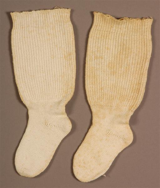 - BeschrijvingWitte katoenen tricot kousjes. Aan de bovenkant een boord van 1r1av ribtricot. beenstuk van hetzelfde breisel, met dikker garen. Rondgebreide voet in plattricot