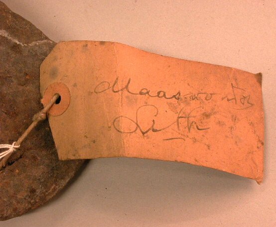 Blok ijzer met vanuit vierkant hamervlak naar convexe splijtrand taps toelopende zijden.