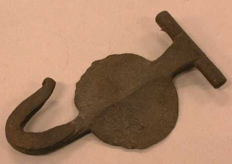 Sterk verticaal verlengd T-vormig ijzer met aangewelde, tot haak naar boven gebogen onderpunt e cirkelvormig platgehamerd middenstuk.