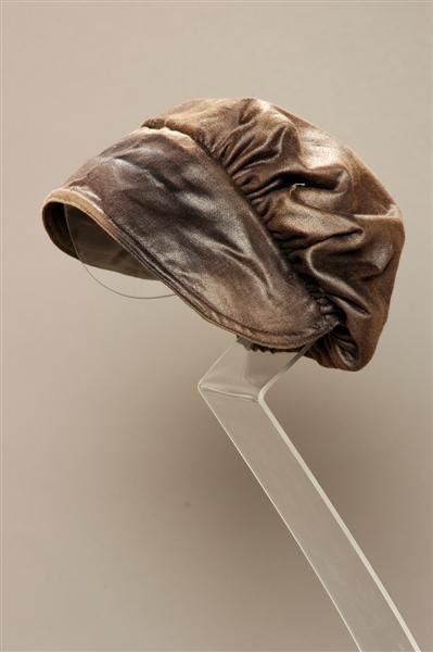 - BeschrijvingMutsje van zwart katoenen satinet, gevoerd met zwarte katoen (platbinding). Schildje (7 cm breed) zeer schuin weglopend naar de zijkanten. In het zoompje aan de voorkant van het schildje is dik wit laiton geschoven. Onderzijde bodem met dikke draad gerimpeld.