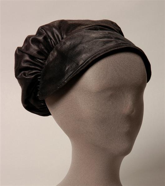 - BeschrijvingMutsje van zwart katoenen satinet, gevoerd met zwarte katoen (platbinding). Schildje (7,5 cm breed) zeer schuin weglopend naar de zijkanten. In het zoompje aan de voorkant van het schildje is dik wit laiton geschoven. Onderzijde bodem met dikke draad gerimpeld. In 1986 ongenummerd aangetroffen.