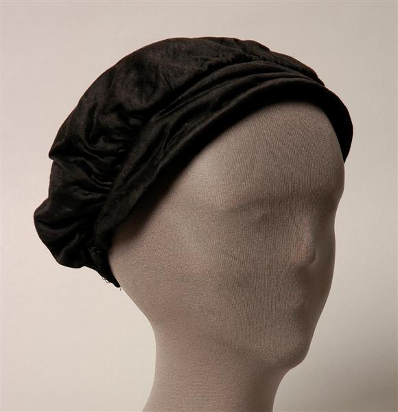 - BeschrijvingMutsje van zwarte katoenen satinet, gevoerd met donkerblauwe katoen in platbinding. Schildje (4.5 cm breed) zeer schuin weglopend naar de zijkanten. Dik laiton in zoompje aan de voorkant van het schildje geschoven. Onderzijde bodem met 2 dikke draden gerimpeld. In 1986 ongenummerd aangetroffen.