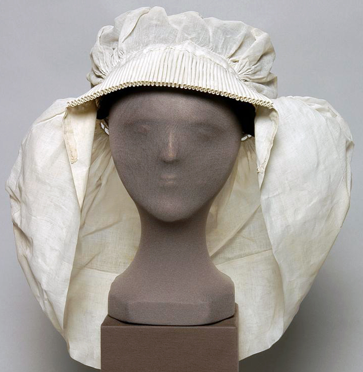 - BeschrijvingMuts van neteldoek, rouwdracht (en/of daagse dracht?). Geplooid voorstrookje, verstevigd met 2 draden dik laiton en een draad dun laiton (meegeplooid en aan beide zijden doorlopend op een klein strookje neteldoek op de achterstrook). Schildje 1.5 cm breed. Gehaakt laddertje met 2 doorgeschoven veterbandjes. Effen bodem en achterstrook. 12 cm brede zoom in de achterstrook. In 1986 ongenummerd aangetroffen.