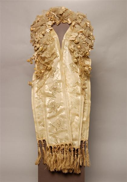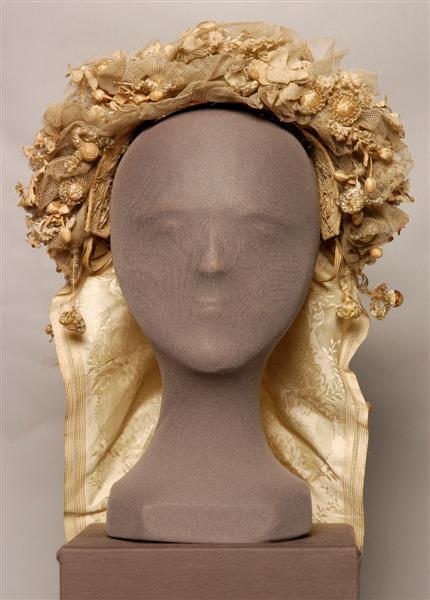 Geheel cremekleurige poffer. Sterk rond gebogen romp van stijf gesteven wit katoenen gaas, verstevigd met dik laiton. Oren elk bestaande uit 2 rondgebogen bandjes. De bandjes lijken op sutiƫn waarvan de katoen vervangen is door papier. Onder op de romp is een elastiekje genaaid. Midden achter is een katoenen lapje genaaid. Boven de oren zijn aan iedere zijde 2 zijden linten (strikken) genaaid. Lint in satijnbinding met daarover een brede slingerende band in ribsbinding versierd met bloemen. Open randjes langs de zelfkant. Onder aan de strikken zijden flossen. Over de strikken zig-zags gewijze vastgezette machinale kant. Op de romp en het bovenste gedeelte van de strikken een versiering van tule en bloemen. Grote en kleine bloemen, van geperst katoen, wattenbolletjes versierd met satijn en chenille, geperste katoenen blaadjes. Bijna geen kleur meer in de bloemen (een enkel restje groen).