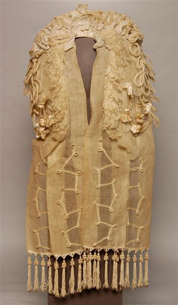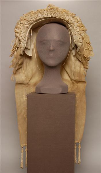 Poffer, waarschijnlijk halve rouw. Romp van hardgesteven gaas. Midden achter is een katoenen? lapje genaaid. Aan de onderzijde is een elastiekje bevestigd. Oren van hetzelfde gaas. Langs de voorzijde van de romp en langs de achterzijde tussen de strikken een geplooide en gerolde strook neteldoek. Strikken van books, aan de onderkant afgezet met kunstzijde flossen. De voorkant van de strikken zijn versierd met tweezijdig gerolde bandjes. De romp is versierd met stroken uitgerafeld neteldoek, gerolde neteldoek lussen en gerolde neteldoek bloemen. Over de bovenste helft van de strikken een zigzaggewijs aangebrachte strook neteldoek, met gestanste gaatjes en geschulpte onderrand. Daartussen zijn enkele bloementakjes verwerkt. Langs de binnenzijde van de strikken een rugje gerolde veertjes.