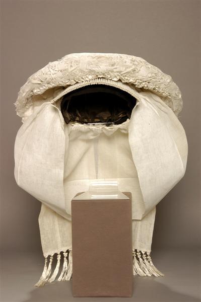 Romp van stijf gesteven gaas, versterkt met dik laiton. Kleine oren van hetzelfde gaas. Onder de romp 2 katoenen lapjes. Langs de voorkant een strook batist in driedubbele stolpplooien opgenaaid. Langs de achterkant tussen de strikken een geplooide strook gerolde batist. Strikken van dubbele genaaide batist versierd met een rayon galon. Franje van rayon. Op de romp een versiering van veertjes en lussen en bloemen van gerolde batist. Zigzagstrook over de strikken van geponste batist met geschulpte rand. Tussen deze strook veertjes, bloemen en lussen van gerolde batist, langs de binnenkant een tak met geponste en geknipte blaadjes van batist. Over het geheel van bloemen en veertjes een tulen netje. In 1986 ongenummerd aangetroffen.