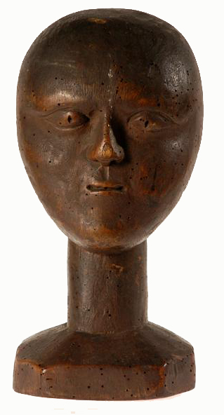 Donkerbruin houten hoofd op aangesneden voet, gebruikt bij het maken van Brabantse mutsen.