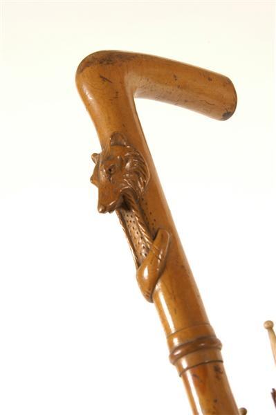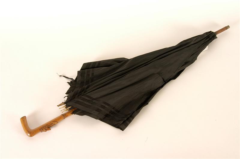 Blankgelakte houten stok. Handgreep van tak met zijtak gesneden. Op de stok een gesneden hondekop, met in zijn bek een hoorn aan draagkoord. Tussen stok en handgreep een houten ring (aangesneden of los tussengevoegd?). Aan de onderkant van de stok een koperen dop. 8 houten baleinen met benen dopjes. Aan de baleinen scharnierende metalen stangetjes met een oogje. De scharnieren zijn met een lapje stof beplakt. Om de stok een zwart gelakte metalen huls met gleuf. Aan de metalen huls de mogelijkheid om de metalen stangetjes te bevestigen. Op de stok 2 scharnierende metalen nokken. Bekleding van zwarte zijde met 3 ingeweven randen langs de zelfkant. Handgenaaid. In 1986 ongenummerd aangetroffen.