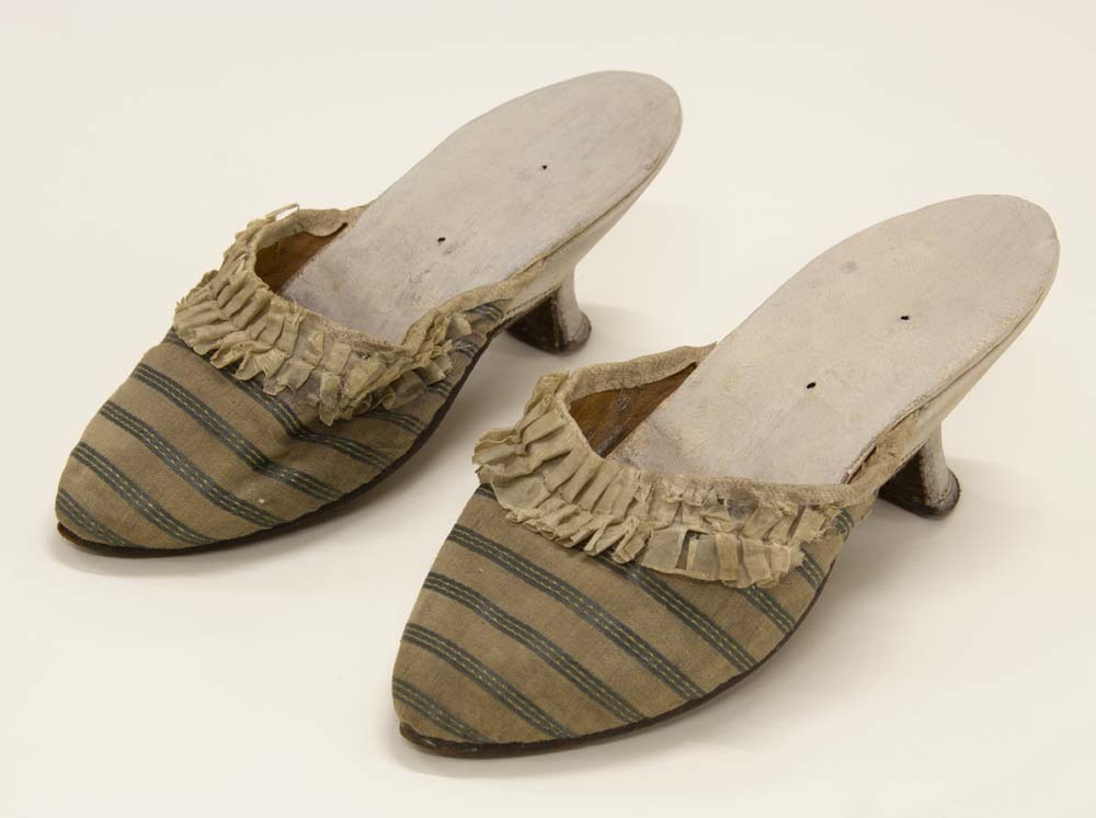 - BeschrijvingZijden muiltje met hoge (diabolo) hakken en puntig toelopende neus. De voorvoet wordt bedekt met gestreepte zijde (rose/lila met ingeweven groene strepen, tussen de strepen gele stippen). Langs de bovenzijde een ruche van witte zijde. Binnenzool en hak van witgeverfd leer. Bruine leren loopzool. In de binnenzool 3 gaatjes.