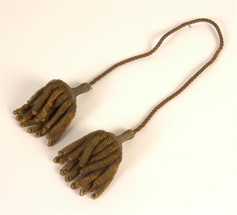 - BeschrijvingTwee goudkleurige kwasten met elk 15 dikke bouillons, een omvlochten peer en een koord dat 6 maal om de kop van de kwast gewikkeld is. De kwasten zijn met elkaar verbonden door goudkoord.
