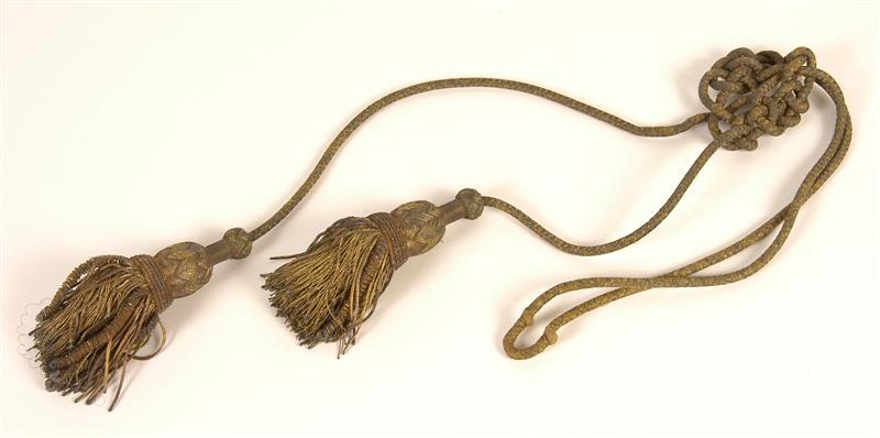 - Beschrijving2 goudkleurige kwasten aan goudkoord. Kwasten: peer met 2 omvlochten bollen, koord 6 maal om de kop gewikkeld. Franje met 6 bouillons en torsade. Het koord is dubbel gevouwen en halverwege in een sierknoop gelegd. In 1986 ongenummerd aangetroffen.
