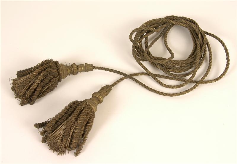 - Beschrijving2 fantasiekwasten in zilverdraad, -torsade en -bouillon. Fantasieperen omwikkeld met goud(?)-draad. Kwasten verbonden met goud(?)koord. In 1986 ongenummerd aangetroffen.