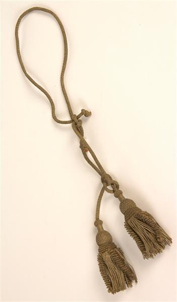 - Beschrijving2 kwasten van goud(?)koord. Genette peren. 2 kwasten verbonden met een goud(?)koord. Door de knopen een tweede koord. In 1986 ongenummerd aangetroffen.