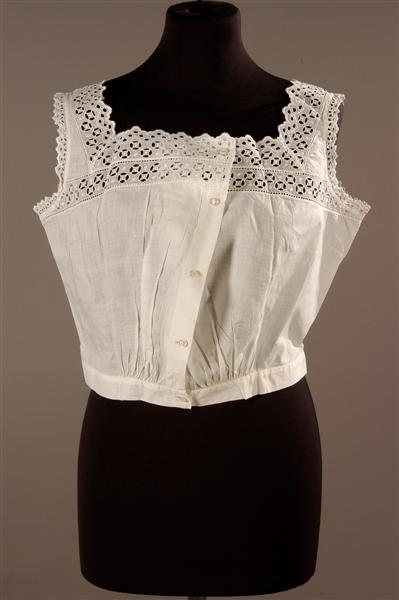 Lijfje van witte katoen, afgezet met stroken machinale kant
