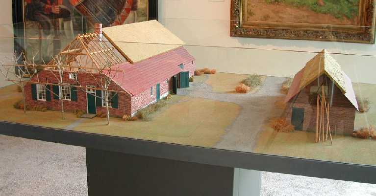 - BeschrijvingMaquette van de thans verdwenen langgevelboerderij Oudestraat 9 te Keldonk (gem. Erp) op basis van gegevens van de Stichting Historisch Boerderij Onderzoek te Arnhem. Schaal 1:25