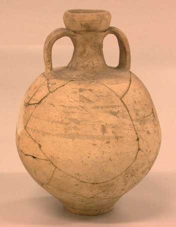 Kruikamphora. Fors. Vrij smalle voet loopt in een rechte lijn wijd uit tot aan de grootste buikomvang, die beneden het midden van de buik ligt. Via een knik wordt de buik naar boven toe iets minder wijd om dan plotseling naar de hals toe te worden vernauwd. De hals loopt uit in een ringvormige bovenlip, die enigszins afgeplat en vrij breed is. Diametraal tegenover elkaar zijn 2 oren aangezet vlak tegen de lip aan. Bij de overgang van buik naar hals zijn 2 versierende lippen getrokken. De kruik is vervaardigd van witte klei en is gladwandig.