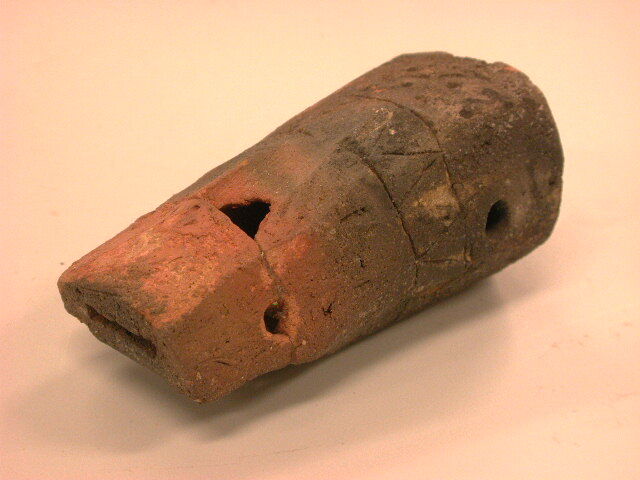 - BeschrijvingPlatte bodem. Langwerpig, hoekig gesneden lichaam met mondstuk en klankgat. Mondstuk aan beide zijden doorboord, onderzijde lichaam éénmaal overdwars (voor ophangkoord?). Rode scherf versierd met uit gekraste driehoeken bestaande band rond lichaam en dwars kruis met stippen tussen de balken daaronder (zonneradmotief?).