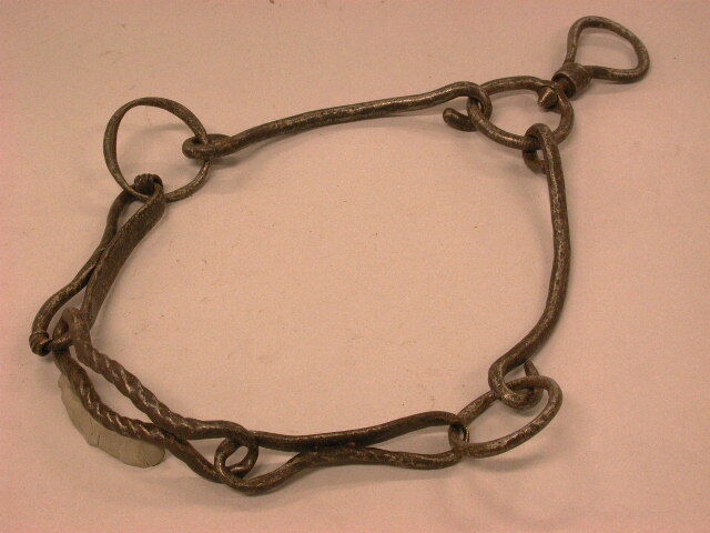 - BeschrijvingSoort paardenbit met halsketen, ijzer. In totaal 9 onderdelen: wartel met twee gebogen ijzers: aan elk een ronde schakel. Aan beide ronde schakels een ovale schakel, die in het midden is samengeknepen en waarvan een zijde plat en breed is.:Bbeide ovale schakels worden verbonden met een schakel die tweemaal is samengeknepen.