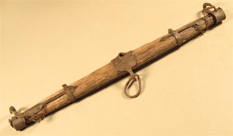 Mooie zwing (disselboom) met zwaar sierbeslag en trekhaken (verankerd door middel van kettingen en pennen).