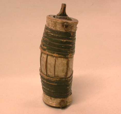 - BeschrijvingHouten drankvaatje, geknipte tonnetje met rieten verbindingen koperen oogjes tinnen mondstuk beschilderd. Gebruikt bij de jacht.