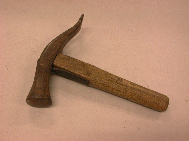 - BeschrijvingHamer met een platte bek en een plat-ronde knop. In de bovenzijde (die iets gewelfd is) zijn de letters VVDK geïncrustreerd. De platte steel is in de kop bevestigd d.m.v. twee strippen die van boven door het gat in de hamerkop heengeslagen en vastgenageld zijn aan de steel.