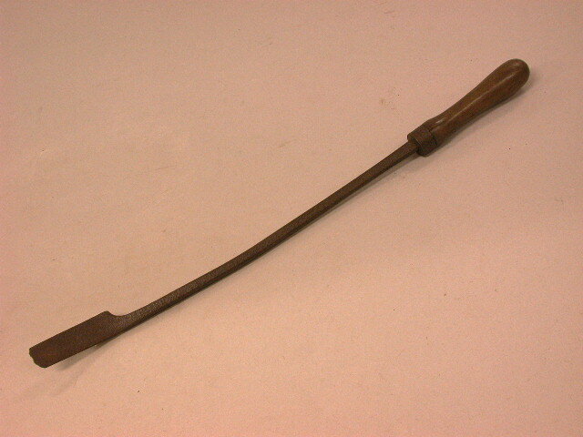- BeschrijvingLange ijzeren steel die uitloopt in een iets omhoogstekend plat blad (dat t.o.v. de steel naar rechts uitsteekt). Het houten handvat zit om de steel heen en is voorzien van een ijzeren band ter bevestiging.
