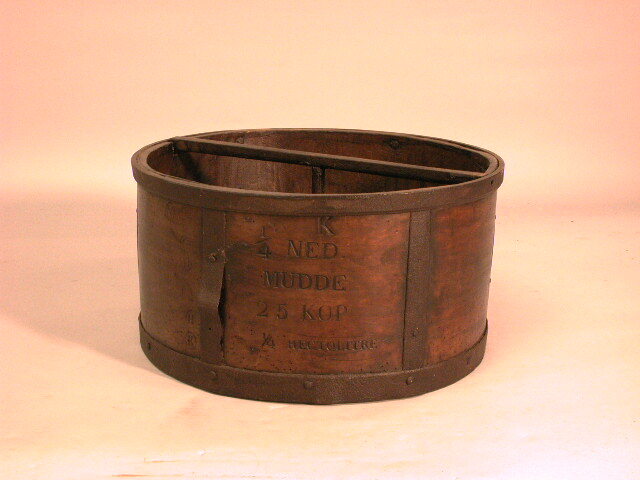 Korenmaat met zijwand uit één band en bodem uit drie planken, verstevigd met ijzeren banden en repen. Matige conditie.