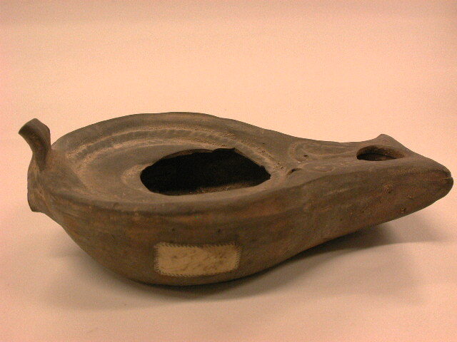 - BeschrijvingZogenaamde vogelkoplamp. Van rode klei, met sporen van vernis. Secundair verbrand.