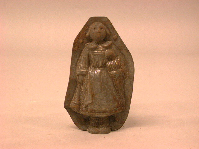 - BeschrijvingTweedelige vorm om een chocolade meisje (boerinnetje) met paraplu te gieten.