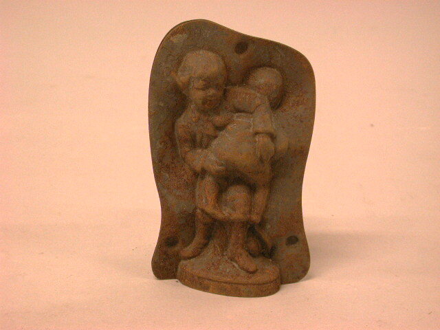 - BeschrijvingTweedelige vorm om een chocolade pop te gieten: grotere jongen slaat een kleinere.