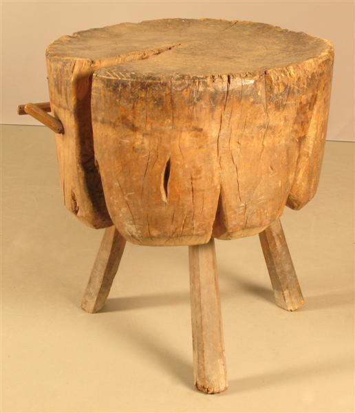 - BeschrijvingPast op 3 flinke poten met 2 houten pennen aan een zijde. Het houten blok is gespleten.