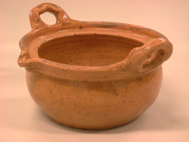 - BeschrijvingVlakke bodem. Afgeplat bolvormig lichaam. Uitstaande hoekige rand met dekselgeul aan binnenzijde en sneb. Twee horizontale, geprofileerde, opwaarts gerichte bandoren op rand. Rode scherf. Lichtoranje met donkerbruine veegjes behalve op bovenkant rand en bodem en iets boven bodem.