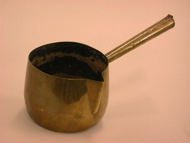 - BeschrijvingPan met platte bodem, iets bolle zijkant en holle steel met ophangring middenvoor en sneb. Van binnen vertind kalkaanslag.