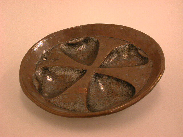 Roodkoperen pan met opstaande rand en 4 harten tegenover elkaar aan bovenzijde vertind. De steel ontbreekt. Werd in Lage Mierde gebruikt op Nieuwjaarsdag.