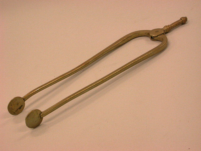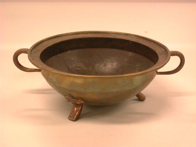 - BeschrijvingGeelkoperen schaal, aan de binnenzijde vertind (met binnenrand) en 3 roodkoperen pootjes, 2 dito oren (?-vorm). Geelkoperen tang met platte bek (cirkelvormig) voor kooltjes vuur. De knop van de tang is een beetje beschadigd.