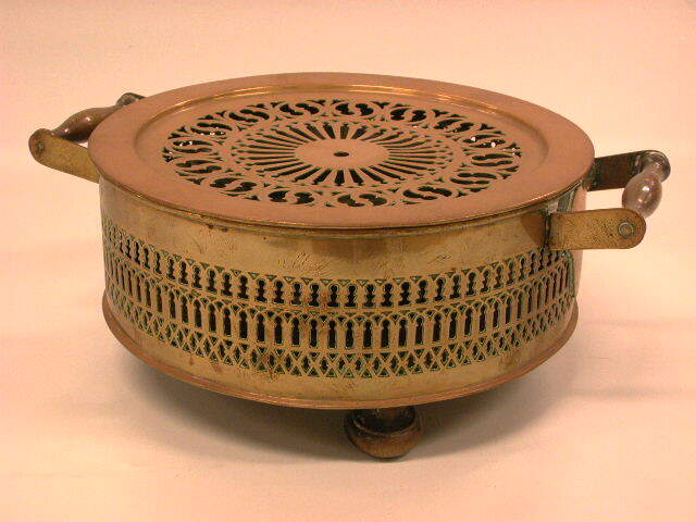 - BeschrijvingCylindrisch geelkoperen komfoor met sierlijke perforatie op drie gedraaide en geprofileerde voetjes met horizontale oren waarin eveneens gedraaid hout is verwerkt. Van binnen vertind(?).