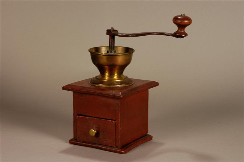 - BeschrijvingHoekig hartje met geprofileerde bodem- en bovenplaat, laatje met geelkoperen knop geelkoperen reservoir aan bovenzijde met ijzeren draai (maal-) werk en beuken knop.