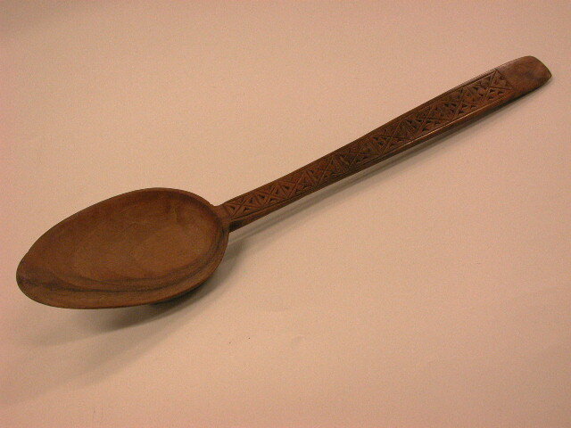 Houten lepel waarvan de steel aan voor- en achterzijde gedecoreerd is met kerfsneemotieven.