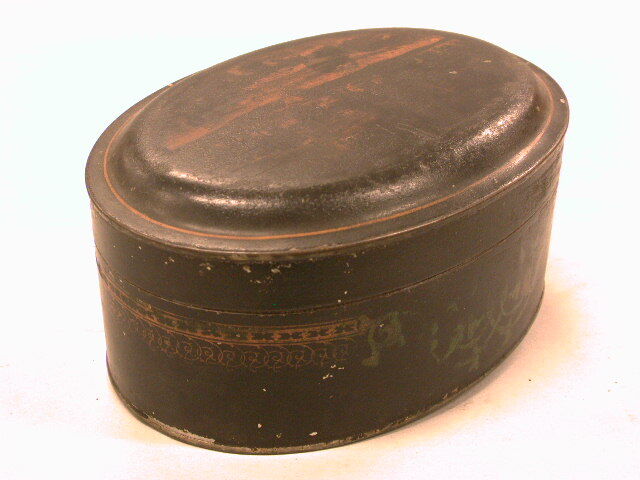 - BeschrijvingOvaal trommeltje met scharnierend deksel. Geheel zwart geschilderd met op de deksel een stadsgezicht (in goudkleur of oranje) en langs de bovenrand van de trommel een sierrand onderbroken door ornamenten.