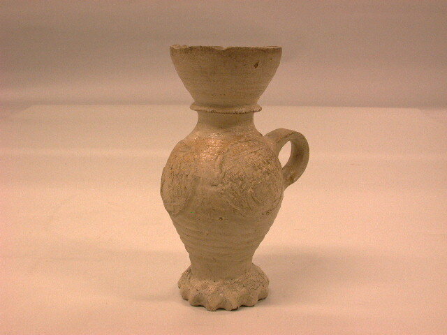 - BeschrijvingSteengoed zonder glazuur en met drie applique's met dezelfde voorstelling, mogelijk de opwekking van Lazarus.