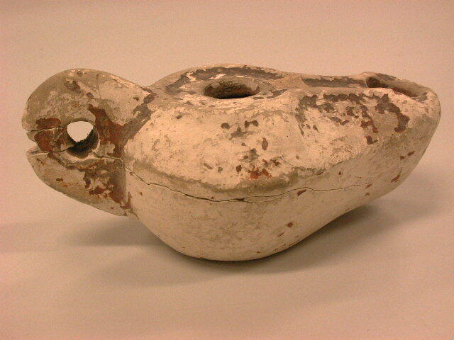 Firmalamp met kanaal. Gedrongen vorm. Van witte klei met roodbruin vernis