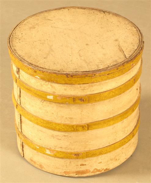 - BeschrijvingWit en geel geschilderde ton met deksel. Deze ton bestaat uit 4 brede beuken banden die tot een cirkel zijn vastgeniet. Ze zijn met elkaar verbonden door smalle hoepeltjes die aan de buitenzijde fel geel geverfd zijn. De bodem bestaat uit twee plankjes. De deksel bestaat uit een eiken ronde plaat en een beuken rand.