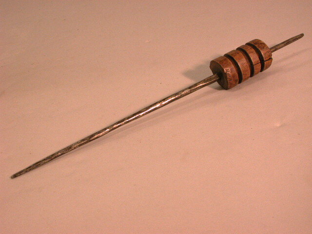 - BeschrijvingTweedelige spil bestaande uit een lange conische staaf en een wiel. In het wiel zijn drie groeven gedraaid voor het geleiden van de snaar van een groot wiel (handspinnewiel).