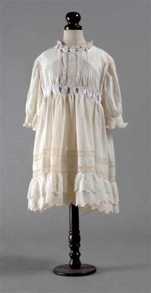 Wit jurkje van katoenen batist, versierd met machinale valencienne kant, randen en laize frou frou van Zwitsers borduurwerk. Lijfje samengesteld uit 6 kanten bandjes en 5 geborduurde randen, afgewisseld met koppeltjes. Mouwtjes aangezet met open randjes en versierd met geborduurde randen en kant. Wijde, aangerimpelde rok met horizontale rand van borduurwerk en kant. Daaronder 2 over elkaar vallende stroken met borduurwerk. Langs hals en in taille laize frou frou met doorgeschoven lila satijnen lintje van viscoserayon (nieuw?). Sluiting middenachter met de linter, 3 parelmoeren knoopjes en 3 trensjes.