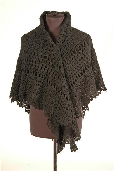 - BeschrijvingGehaakte zwarte wollen omslagdoek. Fanntasiepatroon, voornamelijk in stokjes gewerkt.